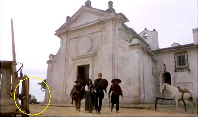Até mesmo a equipe de Sergio Corbucci cometia falhas como esta em que nota-se um automóvel estacionado do lado da igreja.